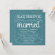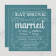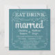 Eat, Drink, and be Married -- Vintage style rustic country wedding invitations -- Swirly, curly scrolls and old-fashion typography on tropical teal turquoise ocean blue burlap background. Add your names and wedding info in this easy to use template. Elegant but fun and whimsical, chalkboard style script writing can be modified for your formal or semi-formal retro wedding theme. Casual modern style is perfect for trendy contemporary weddings with a fun touch of sophisticated charm for the traditional bride and groom. Please contact us for help with customisation if you need additional room for your wedding details. Other sizes and chalkboard styles available. NOTE: This product design is set-up for square cards only -- requires extra postage.
