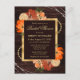 Gorgeous Rustic Watercolor burnt orange fall autumnal flowers floral design on a brown wood background with gold foil border and string lights