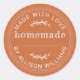 Rustic burnt orange round sticker with a handmade look featuring the phrase Made with Love Homemade. Ideal for labeling homemade baked goods, jams, candles, soaps, or crafts. The warm autumn tone adds a cozy touch to packaging and is perfect for seasonal markets or gift wrapping.