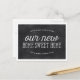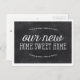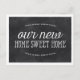 This pretty, rustic change of address announcement features the phrase "Our new home sweet home" written in elegant "chalked" calligraphy, a laurel frame, and a chalkboard background. Add your new address to the back of the post card.