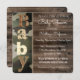 A beautiful baby shower invitation with rustic and outdoorsy elements. Rustic wood with camouflage and the word "Baby" in cool letters. Line by line customisation. Rustic wood on the back. A great invitation for a military or outdoorsy family.