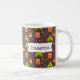 Coffee mug with a fun camping themed pattern. Set on a reddish brown background. Elements in the pattern include a campfire, a tent,. a guitar, a shovel and backpack. Personalise with a name over a white ribbon shaped frame.