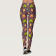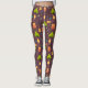 Leggings with a fun camping themed pattern. Set on a reddish brown background. Elements in the pattern include a campfire, a tent, a guitar, a shovel and backpack.
