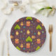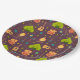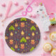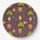 Paper plates with a fun camping themed pattern. Set on a reddish brown background. Elements in the pattern include a campfire, a tent,. a guitar, a shovel and backpack.