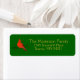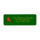 The left-hand side of this holiday return address label features a beautiful red cardinal sitting on a deep green branch on which small green leaves and red berries are growing. The cardinal holds a small branch with leaves and berries in his beak. The design is set against a dark green background, The right hand side displays the personalizable name and address in elegant gold type. These labels can be used with the Rustic Country Cardinal on Branch with Berries holiday cards or on their own.