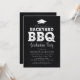 Rustic bbq graduation party invitation featuring a graduation cap at the top and chalkboard lettering with a black chalkboard background. Personalise the chalkboard graduation party invitation with the graduate's name and party details. The invites are perfect for both high school and college graduation parties!