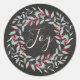 Rustic country xmas stickers featuring a chalkboard background, the word "joy" in an handwritten calligraphy font, and a festive green and red berry christmas wreath.