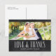 This rustic photo thank you postcard features the text "Love and thanks" in a handwritten-style font against a chalkboard background. Personalise with one of your favourite wedding photos.