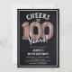 Celebrating turning 100! These 100th birthday party invites are designed with the title 'Cheers to 100 Years!'. Featuring a rustic chalkboard background, rose gold number one hundred helium balloons, trendy white typography and a simple birthday party template that is easy to customise.