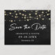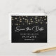 Personalised rustic chalkboard wedding save the date postcards featuring a black chalkboard background adorned with string lights. Easily personalise this rustic save the date postcard with your wedding details including a wedding website, if desired. For custom requests, please send us a message.