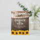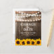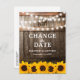 Sunflower change the date postcard featuring a country oak barrel background, twinkle string lights, golden yellow sunflowers, your monogram and a save the date template. Find other change of plan cards at www.zazzle.com/special_stationery.