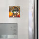 A magnet with a photograph of a thanksgiving harvest, set on a rustic wooden table. Pumpkin, potatoes, squash etc... make up this bountiful collection of food. Colourful autumn leaves surround the cornucopia basket.