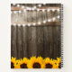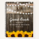 Rustic chic wedding guest notebook featuring a country barn dark oak barrel background, twinkle string lights, sunflowers, your monogram and modern guestbook template that is easy to personalise.