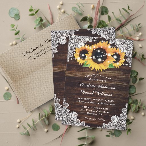 Custom rustic wedding RSVP cards featuring sunflowers, burlap, lace and barn wood. Perfect card design to complement your rustic country, or barn wedding party inspired by sunflower flowers. Matching items available to complement these rustic chic wedding RSVP cards.