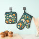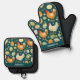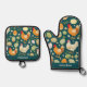 Bring a touch of rustic farmhouse charm to your kitchen with this chickens oven glove and pot holder set. This delightful set features a whimsical pattern of brown and white hens, roosters, and colourful Easter-style eggs on a rich, dark teal background. Personalise the name at the bottom for an individual touch.