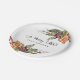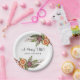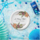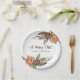 Rustic Christmas theme baby shower plate featuring watercolor illustration of winter botanicals including, mistletoe, pine tree branch, berries, orange, etc. The text says "A Merry Little baby shower." Gender neutral design.