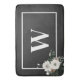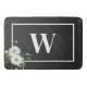 This design is simple, yet makes a statement, with it's monogram initial in white on a soft black background. A white frame is decorated with a rustic bouquet of pine and winter white floral. This bath mat welcomes your holiday and Christmas guests in beautiful understated style. Created by Simply Farmhouse Press.