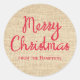 Modern rustic personalised Christmas gift stickers with the words Merry Christmas in red on a stylish printed burlap background. Add your name for a custom touch on baked goods, party favours, and presents.