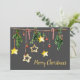 Modern holiday watercolor illustration features rustic handmade Christmas garland complete with evergreen branches and homemade gold stars. Chalkboard black background with gold customisable text.