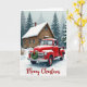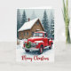 In this winter scene on the card, a bright red old truck stands out in the snowy front with a cozy cabin and snowy trees behind it. The truck has a wreath with a red bow on its shiny front and icicles hanging from its bumper. The card shows a peaceful winter day with soft light and snowflakes falling gently all around. It really feels like a magical holiday moment 🎅🏼🎄🎁.