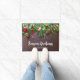 Season's Greetings door mat with a rustic photograph of a brown wooden table with pinecones, pine needles, snow, and Christmas ornaments. Festive and lovely.