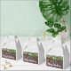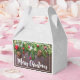 Tiny favour box with a rustic photograph of a brown wooden table with pinecones, pine needles, snow, and Christmas ornaments. Festive and lovely.