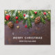Christmas postcard with a rustic photograph of a brown wooden table with pinecones, pine needles, snow, and Christmas ornaments. Festive and lovely.