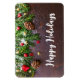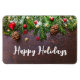 A flexible magnet with a rustic photograph of a brown wooden table with pinecones, pine needles, snow, and Christmas ornaments. Festive and lovely.