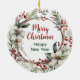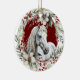 On the front of this Holiday ornament is the image of a beautiful white horse with flowing mane. The portrait is on a Christmas red background, and framed within a rustic twig, red berry, white floral and green leaf wreath. On the back, red and green text says MERRY CHRISTMAS" and "HAPPY NEW YEAR". The text is in customisable text fields, so you may make it say whatever you'd like.