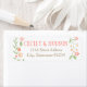 Rustic chic wedding return address labels feature a floral frame of pretty peach, blush pink, coral, and nectarine orange flowers and soft green botanical leaves with hand-drawn look, custom return address text, and background with a subtle and elegant woven textured appearance.