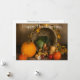 This Thanksgiving card features a beautifully arranged cornucopia overflowing with autumn harvest favorites—pumpkins, squash, apples, leafy greens, onions, and sweet potatoes. Rich fall leaves surround the basket, adding warmth and seasonal charm. Set against a textured brown backdrop, the scene highlights abundance, gratitude, and the cozy spirit of the holiday. The “Happy Thanksgiving” message at the top completes the design with a classic, welcoming touch.