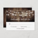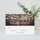 Rustic country wedding RSVP card featuring a barn wood background decorated with burlap hearts and string lights topping your desired response date and custom accept and decline wording.