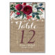 Rustic winter elegant wedding table number (two faces) with editable text featuring dark red burgundy and white peonies with pine green seasonal foliage, strings of twinkle lights and a white lace border on a beige faux burlap background. Ideal for your Christmas / winter elegant rustic country, farmhouse or cottage themed wedding receptions.