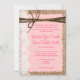 Country Pink and Brown Wedding Invitations. This rustic wedding invitation is perfect for any country western wedding. It features a rustic country printed burlap background on both sides of the invitation. The invitation lettering is printed on an tattered pink rectangle with a printed lace embellishment on the side. The top has a printed twine embellishment. The burlap, lace, and twine are just printed designs. It is not actual burlap fabric or actual lace or twine.