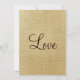 This rustic country western wedding invitation has a printed burlap background with a wood grain paper with elegant scrolls punched in it printed design. It also has a twine bow at the top. This is a flat printed invitation; it is not actual burlap fabric or actual twine. This printed design gives you the look of a hand designed layered invitation, but with the discount prices of a printed invitation. The back of the invitation has the same rustic country style design with the word "Love" in script. You could change this wording to personalise it with the bride and groom's names if you wanted to. These country theme wedding invitations are perfect for cowboy weddings.