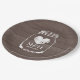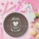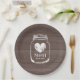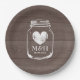 Wood grain panel paper party plates with wedding monogram plus date of marriage. Brown and white. Customisable colour and personalise name initial letters of bride and groom. Elegant typography in rustic country chic mason jar design. Cute romantic design with vintage heart icon. Faded weathered love symbol. Disposable plates for classy wedding, bridal shower, engagement, anniversary or bachelorette party. Customisable background colour. Perfect for outdoor barn wedding in summer around july, august, september.