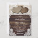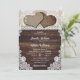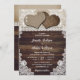This rustic burlap and lace wedding invitation featuring two burlap hearts on a burlap and wood background adorned with white floral lace is perfect for inviting your guests to your romantic rustic country, backyard, farm or barn wedding party. Matching items available.