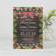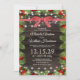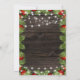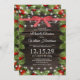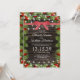 Winter wedding invitations featuring a dark rustic wooden background, xmas green foliage, red tree decorations, string twinkle lights, a gingham ribbon, and a festive celebration template that is easy to personalise.