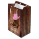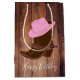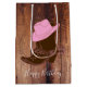 Rustic cowgirl pink hat and brown boots over a wood planks gift bag. Personalise with custom text!