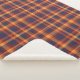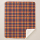Rustic farmhouse style fall plaid sherpa fleece blanket in hues of burnt orange, dark blue, reds, and yellow.