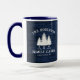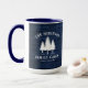 A stylish beautiful, rustic themed, large coffee mug, featuring your name and "Family Cabin", Ranch, Cottage or other text along with its established date and location if desired. This custom, unique design features rustic country style text with a white silhouette of pine trees on a print of wood planks in rich blue colours. To see more designs like this, feel free to visit my store here at "Zazzle.com/Rustic_Charm". Thanks.
