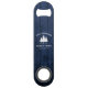 A stylish country rustic themed bar key bottle opener, featuring your name and "Family Cabin", Ranch, Cottage or other text along with its established date and location if desired. This custom, unique design features rustic country style text with a white silhouette of pine trees on a print of wood planks in rich blue colours. To see more designs like this, feel free to visit my store here at "Zazzle.com/Rustic_Charm". Thanks.