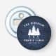 A personalise country rustic themed bottle opener, featuring your name and "Family Cabin", Ranch, Cottage or other text along with its established date and location if desired. This custom, unique design features rustic country style text with a white silhouette of pine trees on a print of wood planks in rich blue colours. To see more designs like this, feel free to visit my store here at "Zazzle.com/Rustic_Charm". Thanks.