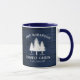 Stylish, rustic themed coffee mugs, featuring your name and "Family Cabin", Ranch, Cottage or other text along with its established date and location if desired. This custom, unique design features rustic country style text with a white silhouette of pine trees on a print of wood planks in rich blue colours. To see more designs like this, feel free to visit my store here at "Zazzle.com/Rustic_Charm". Thanks.