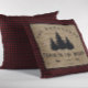 Add a touch of rustic elegance to your space with this beautiful, one-of-a-kind personalised cabin pillow. Featuring a natural burlap-style background, classic black typography, and a serene silhouette of pine trees, this design captures the cosy, peaceful essence of cabin life.