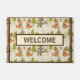 This design features a pair of sweet foxes with fur trees against a cream background. There is a double border around the edges in dark brown and the text reads WELCOME. Makes great gift or home accent for any age or gender.