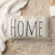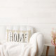 Creamy tan throw pillows with white wheat grain silhouettes design and the word "family" on the front in dark grey. The backside features your family's name in grey.