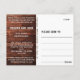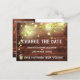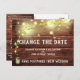 Rustic country wedding wood mason jar string of lights tree branch with green leaves Change the Date postcard. The glowing string of lights illuminate the green leaves against a beautiful rustic dark brown wood. This rustic wedding design is customisable and perfect for your beautiful outdoor country wedding or western wedding.