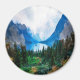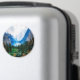 A magnet with a beautiful photograph of a pleasant and tranquil nature scene. Vibrant green forest in the front and shadowy blue mountains in the back. With a dreamy cloudy white sky. Misty and magical feel.