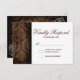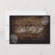 Rustic Country Roses Barn Wood Wedding RSVP Cards with a faded distressed damask design on dark brown barn wood. One side has two roses in white line art sketch in the corners.